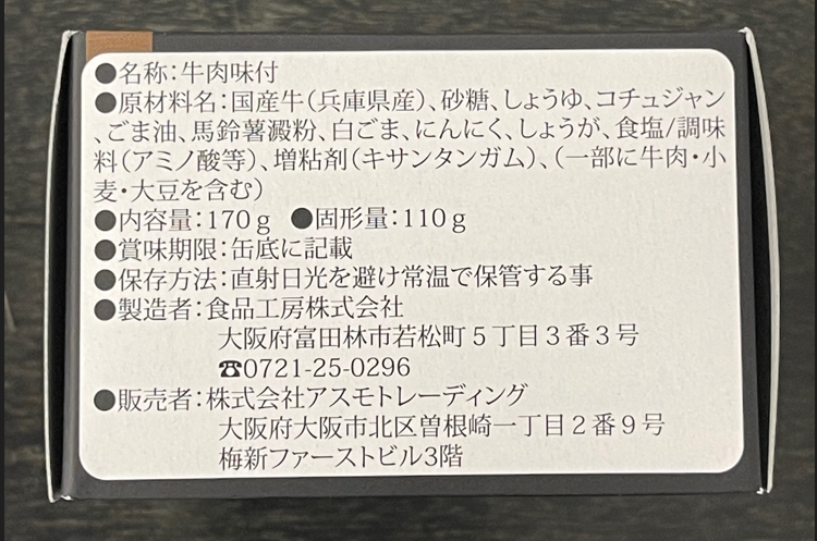 | 原材材料名 | 国産牛(兵庫県産)、砂糖、しょうゆ、コチュジャン、ごま油、馬鈴薯澱粉、白ごま、にんにく、しょうが、食塩/調味料(アミノ酸等)、増粘剤(キサンタンガム)、(一部に牛肉・小麦・大豆を含む) |